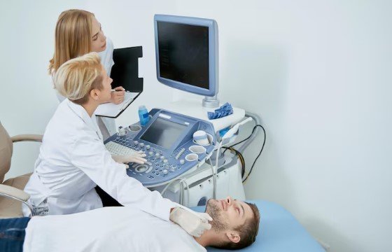 Пациент ложится на кушетку. Врач наносит на кожу гель. Он улучшает контакт датчика с кожей и убирает воздушную прослойку.